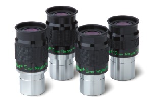 New 82° 13mm, 9mm, 7mm and 5mm focal lengths are a compact 7-element design using different exotic materials plus coating processes. Untouched is the full field pinpoint sharpness, but this new series benefits from greater contrast. All focal lengths feature 12mm of eye-relief. The original 7mm and 4.8mm Naglers will continue in the line as lower cost alternatives.